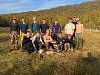 Etter en noe sen start ut fra bussen gikk det ikke ikke mer en 30 minutter før den første reinsdyrflokken kom løpende forbi, en bra start på dagen. Deretter ble det en pause og mye speiding fra Hølrabben. Kikkerten ble brukt flittig og flere flokker ble observert. Guide og kjentmann Terje Tovmo snek seg inn på en liten flokk og med 14 spente ungdommer og to lærere som interessert bisitter på trygg avstand ble en flott reinsdyrkalv felt. Deretter ble det slaktet og båret ut et flott dyr som ble tatt med til lokal slakter og som videre skal benyttes i undervisningen i “mat og helse”-timen på skolen.